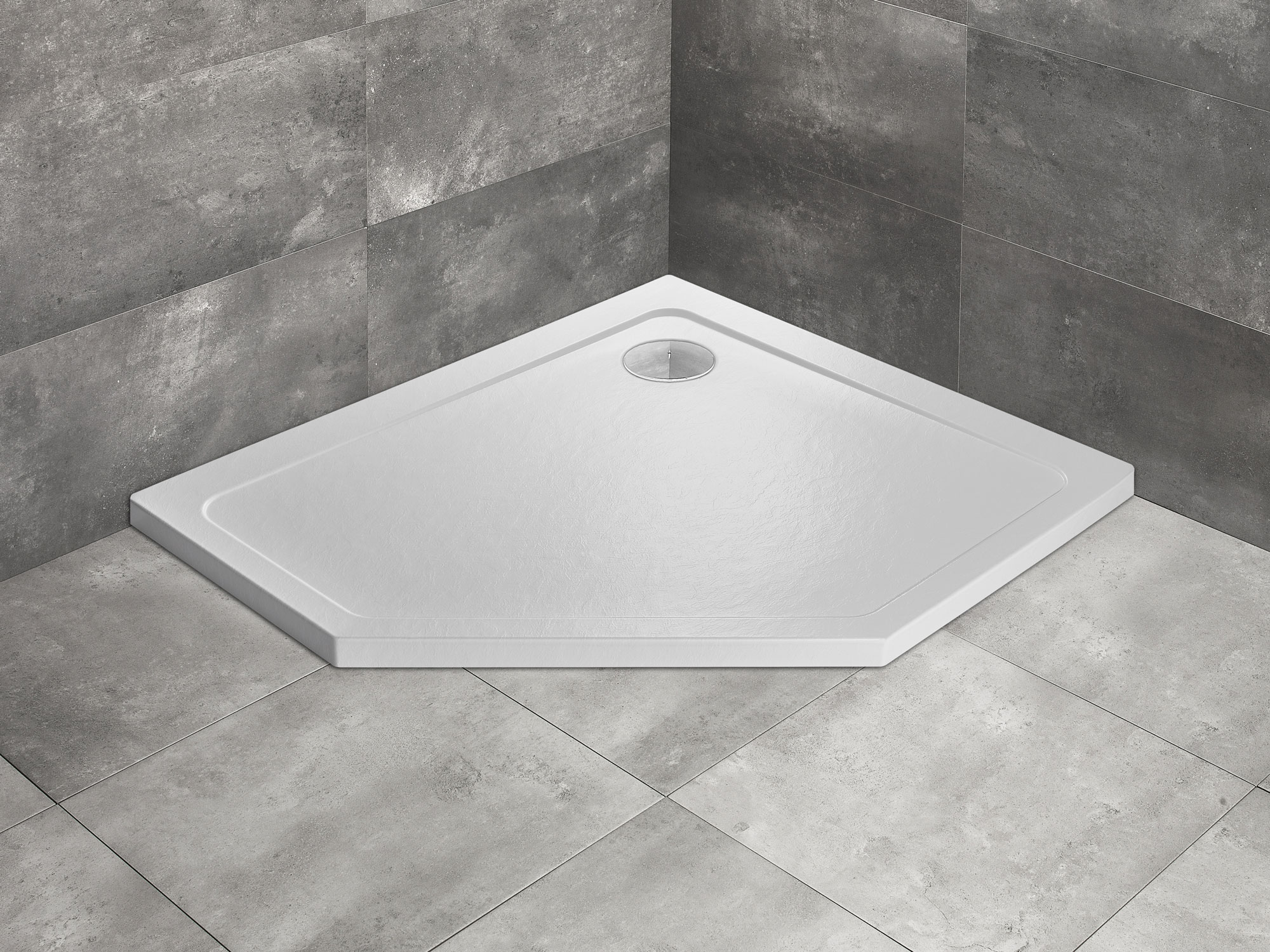 Ötszögletű, aszimmetrikus akril zuhanytálca, közvetlenül a padlósíkra építhető.