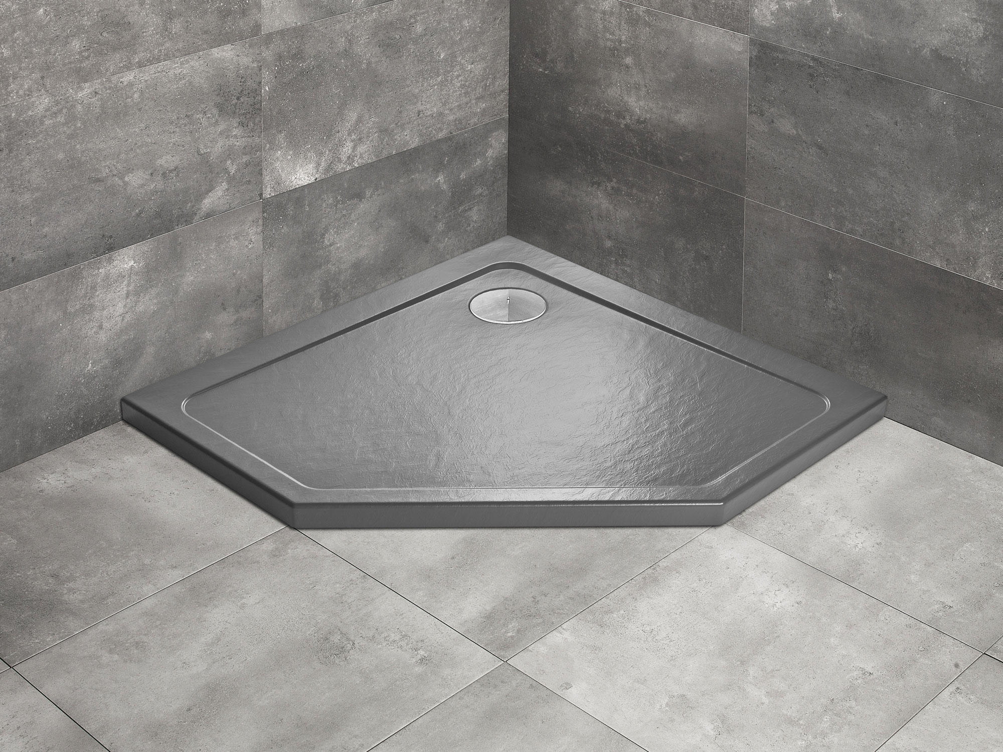 Ötszögletű akril antracit zuhanytálca, közvetlenül a padlósíkra építhető.
