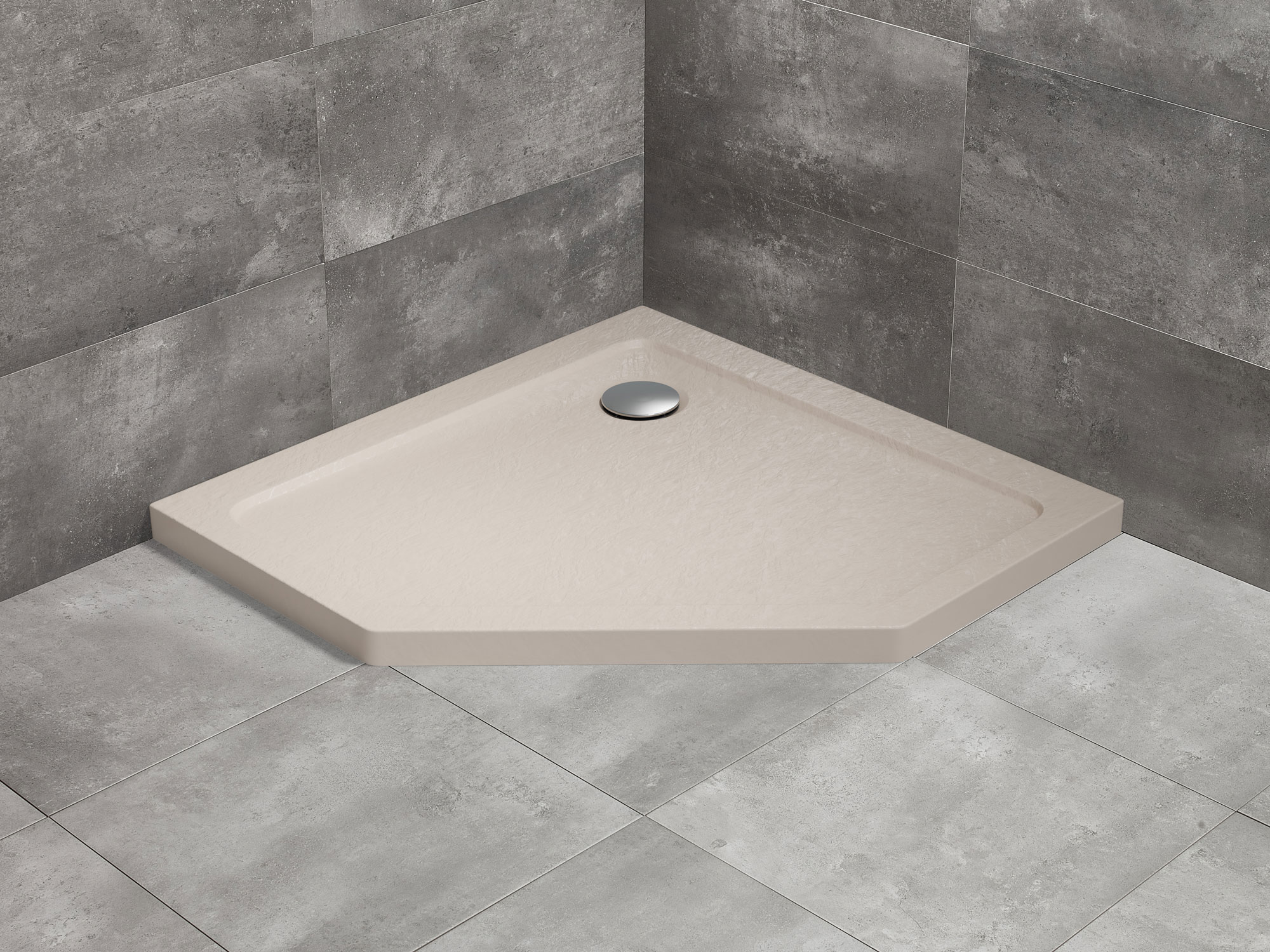 Ötszögletű akril beige zuhanytálca, közvetlenül a padlósíkra építhető.