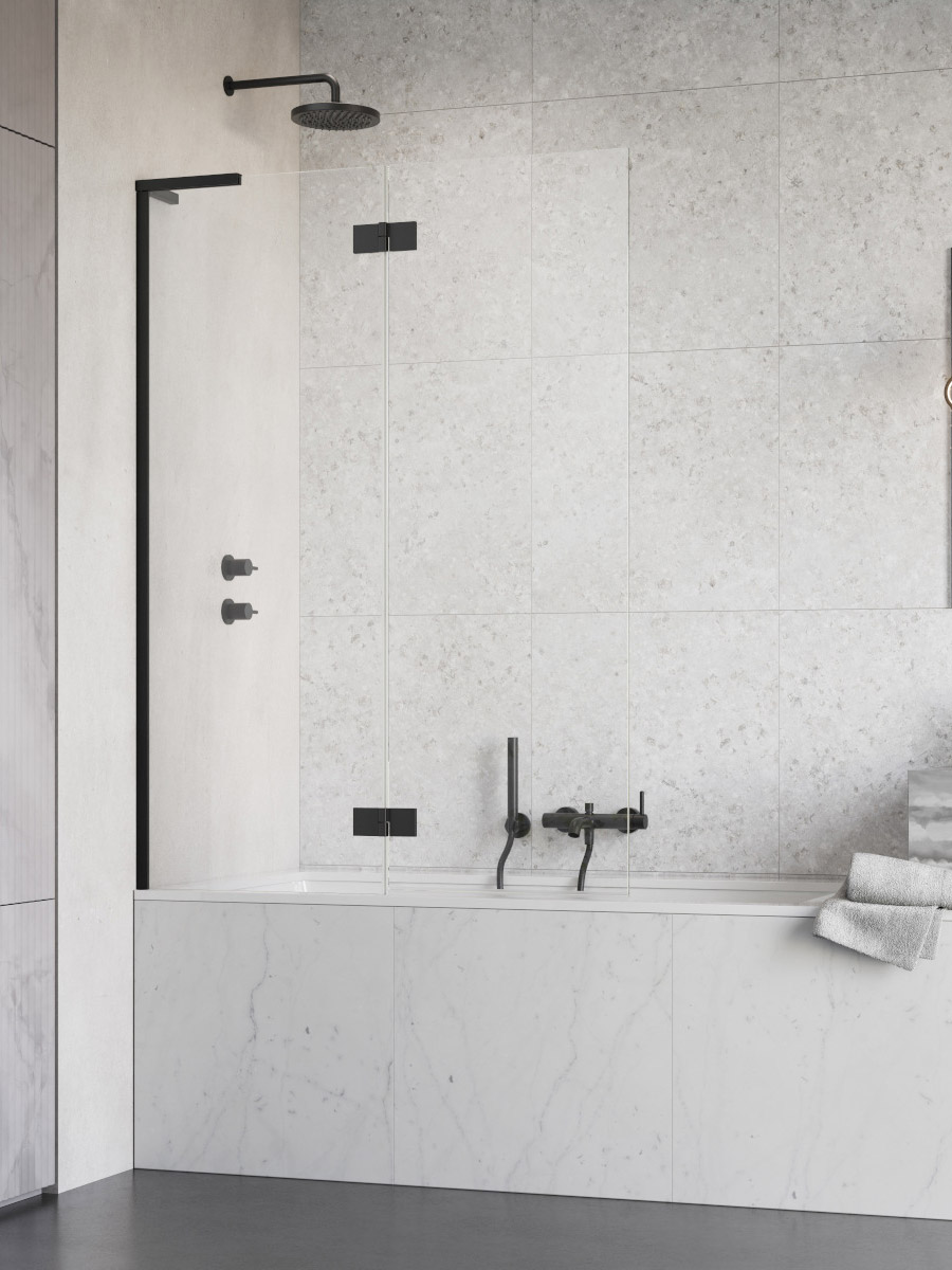 Kifelé nyitható fekete kádparaván egy fix résszel.