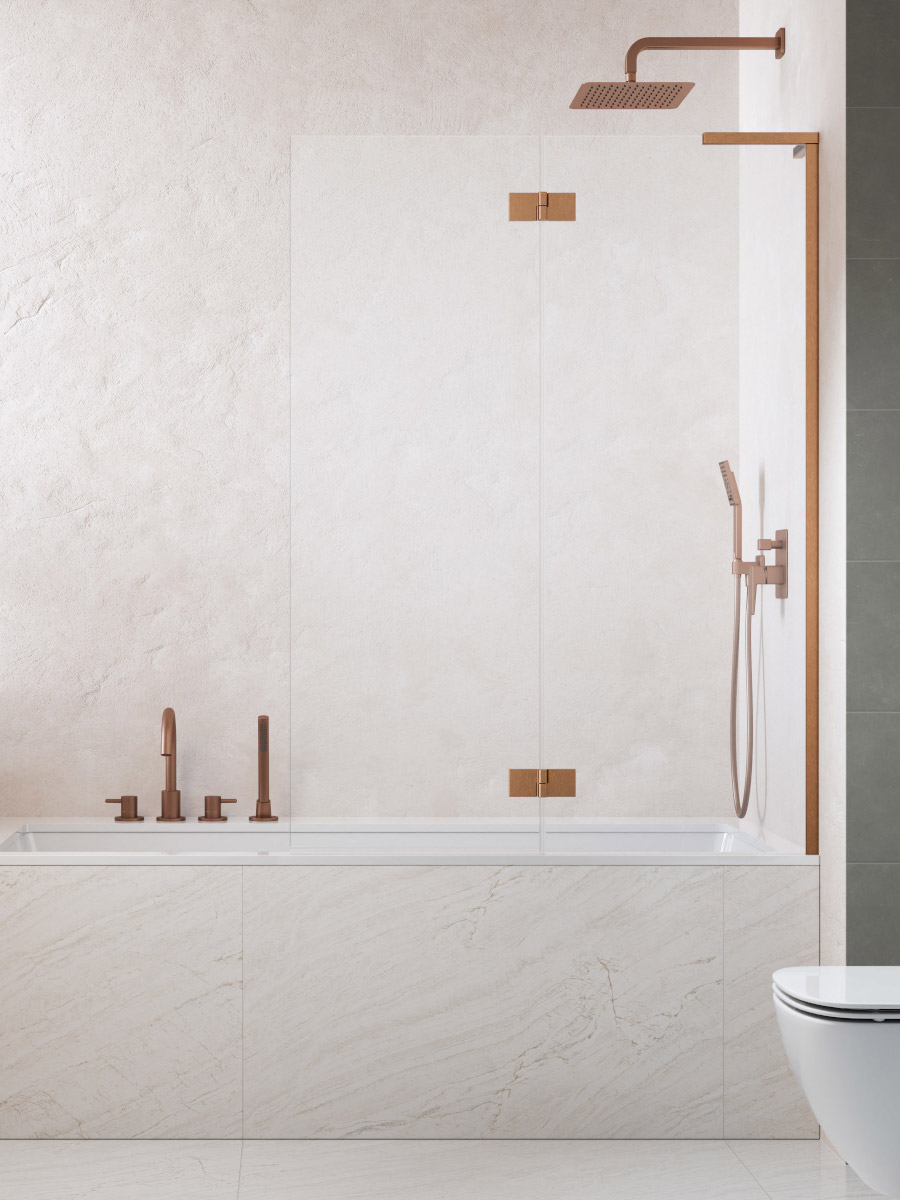 Kifelé nyitható szálcsiszolt réz kádparaván egy fix résszel.