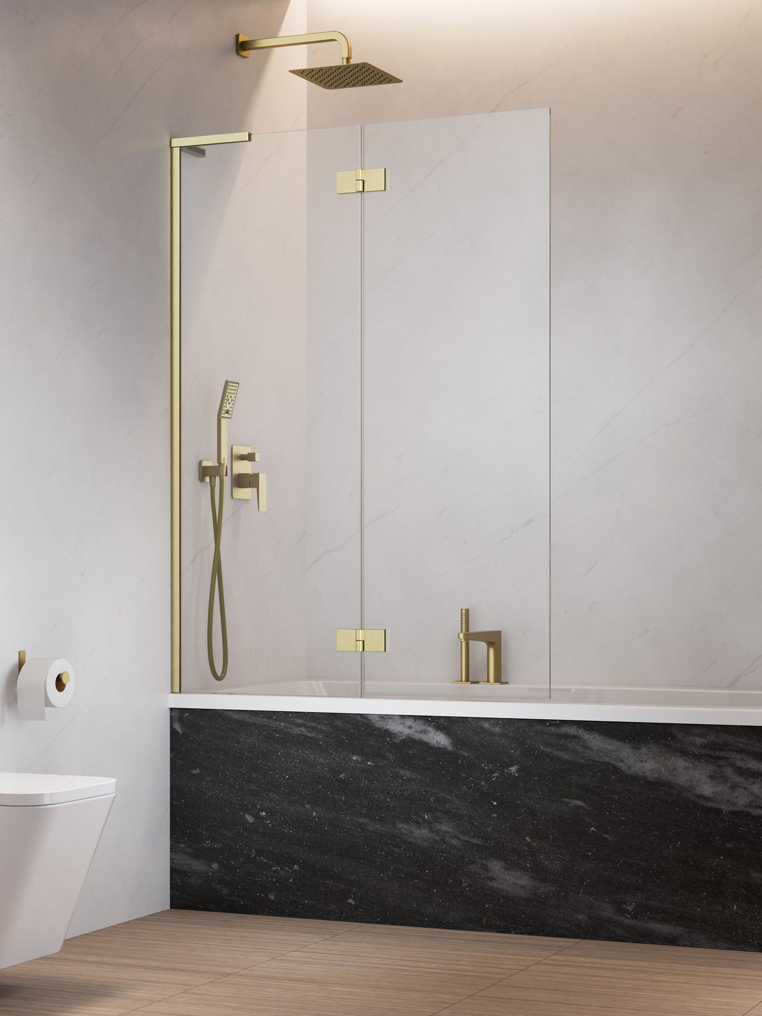 Kifelé nyitható szálcsiszolt arany kádparaván egy fix résszel.